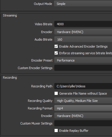 If you’re new to OBS, there are primarily two things to consider. Firstly, if you are just recording, you can click the settings button on the bottom right of OBS and then click the** Output **tab. From here, make sure your recording format is set to MP4.