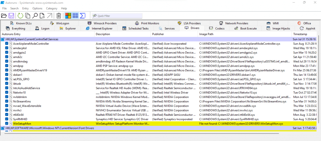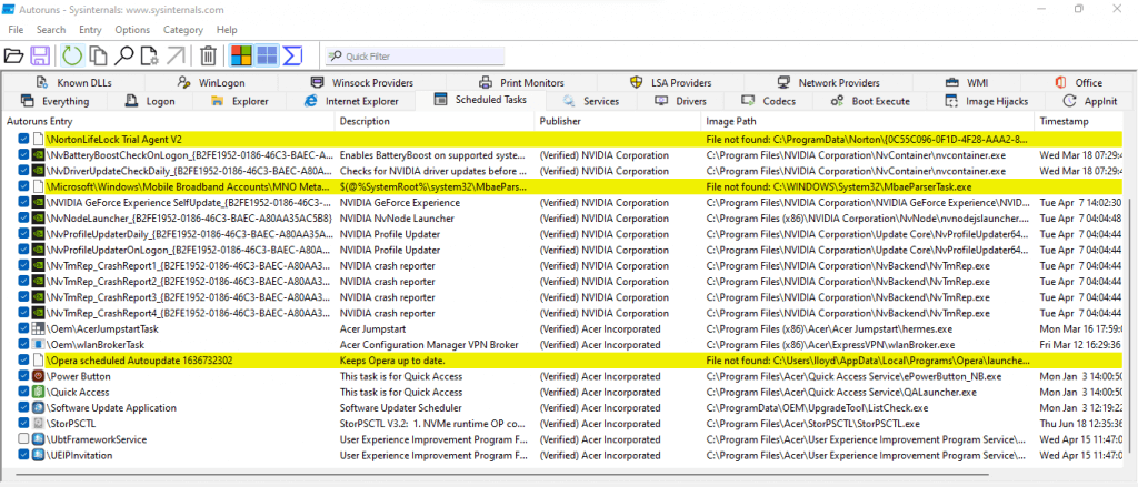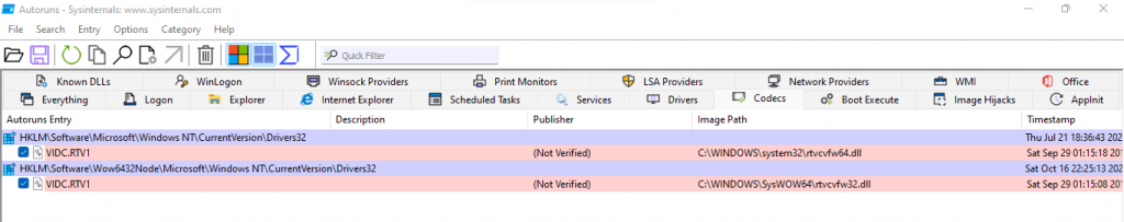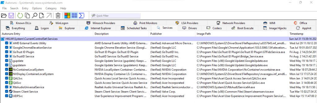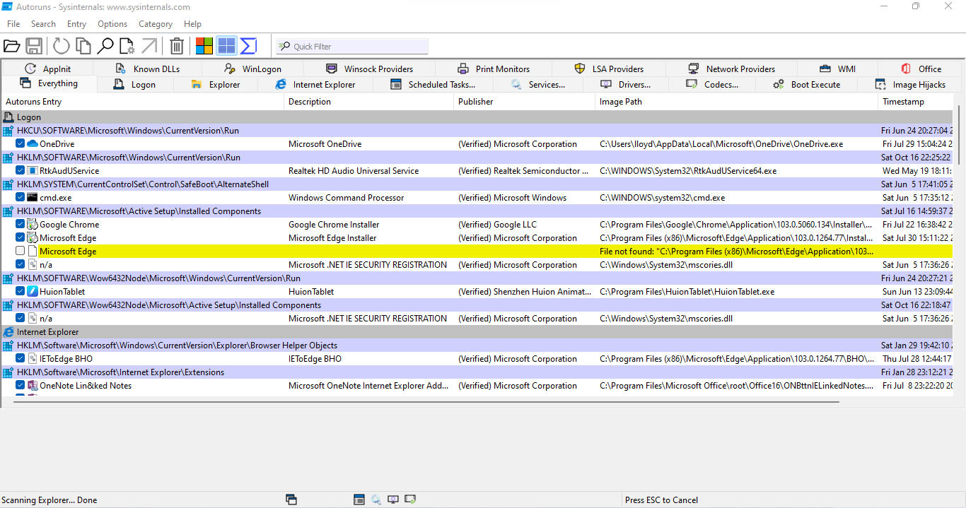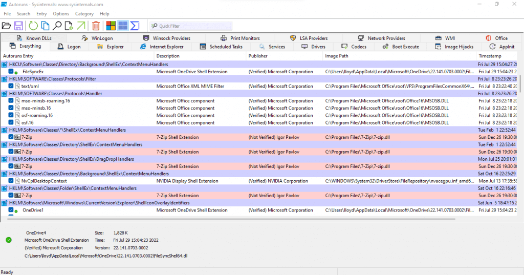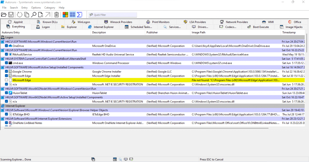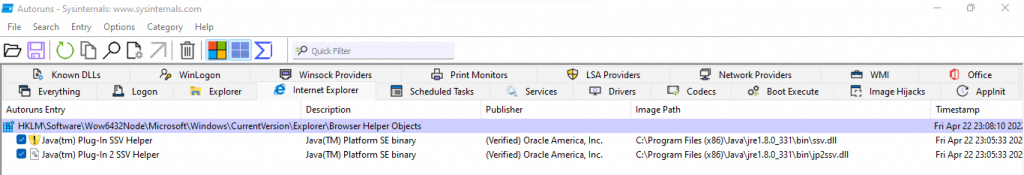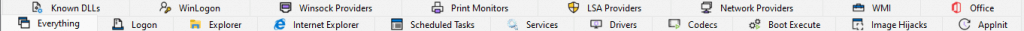 The tabs covered above are the principal tabs in Autoruns. There is another row of tabs like Known DLLs, WinLogon, Winsock Providers, Print Monitors, LSA Providers, Network Providers, WMI, and Office.