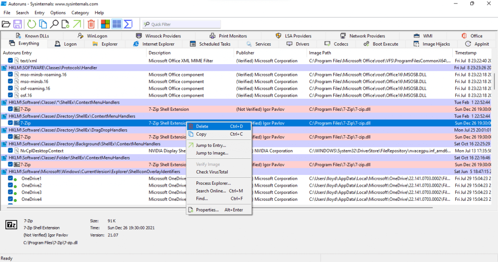 And that’s it. You can scroll through this list at leisure, removing any startup entries you feel are unnecessary. Note that some useful utilities are sometimes unverified as well – for example, 7zip – so make sure to read the names of the programs before deleting their Autoruns entry.