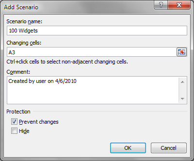 You should now be looking at the Scenario Manager window. Click on the Add button and Excel asks you to name the first scenario. You can choose any name you want but it would be prudent to choose one that is descriptive of the scenario you are creating. For our example here, name the scenario 100 Widgets.