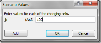 In the Scenarios Values window that opens, type in 100 and click the OK button. Essentially what you have done is created a new what-if scenario that will calculate the total profit if the number of widgets sold in A3 were 100.