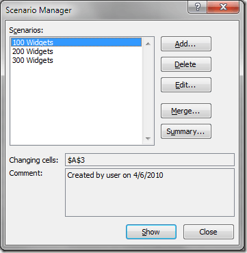 Click on the scenario labeled 100 Widgets and then click the Show button. Notice that cell A3 changes to 100 and cell C3 changes to $1,000. Now, click on the scenario labeled 200 Widgets and then click the Show button. Notice that cell A3 changes to 200 and cell C3 changes to $2,000. Do the same for the scenario labeled 300 Widgets.