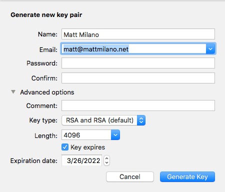 The next step is to create your public/private keys . You will be asked for your name and email address, as well as the password you will enter encrypting and decrypting data.