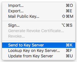 Once your keys have been created, the next step is to upload your public key so other individuals can find it. Once your key is uploaded, anyone with a OpenPGP client will be able to search for your key based on your email address and use it to encrypt emails and files that only you can open.
