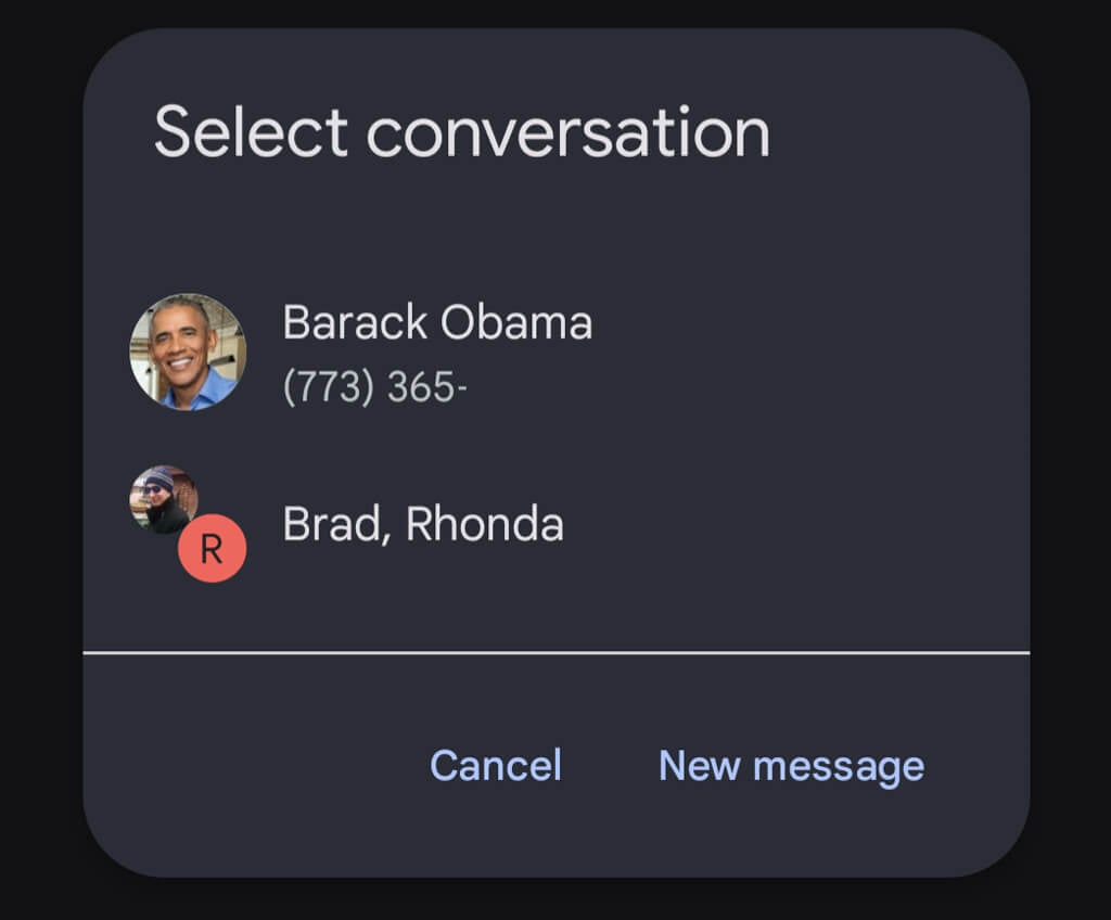 Similarly, choosing the stock Messages app for Android will first give you the option to select a recent text conversation or start a new message.