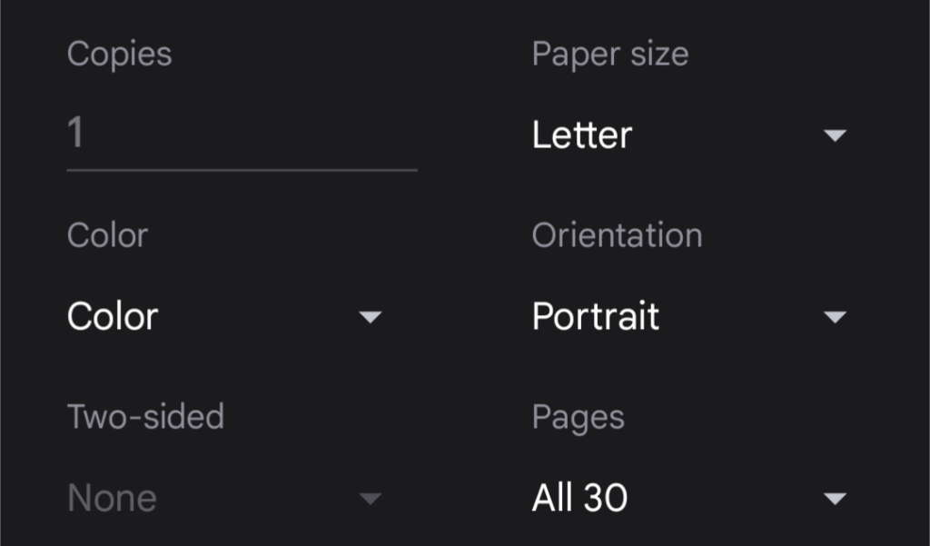 Select a printer and tap to choose options like number of copies, paper size, and orientation.