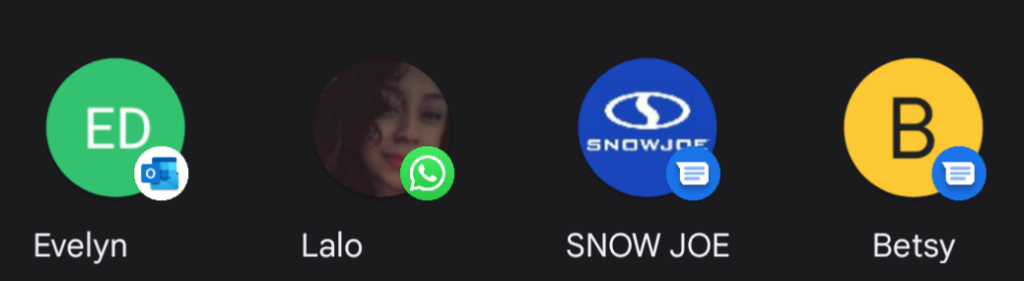 - Recent message recipients. (You’ll see the app Chrome will use to message those people in a smaller circle superimposed on their profile icon.)