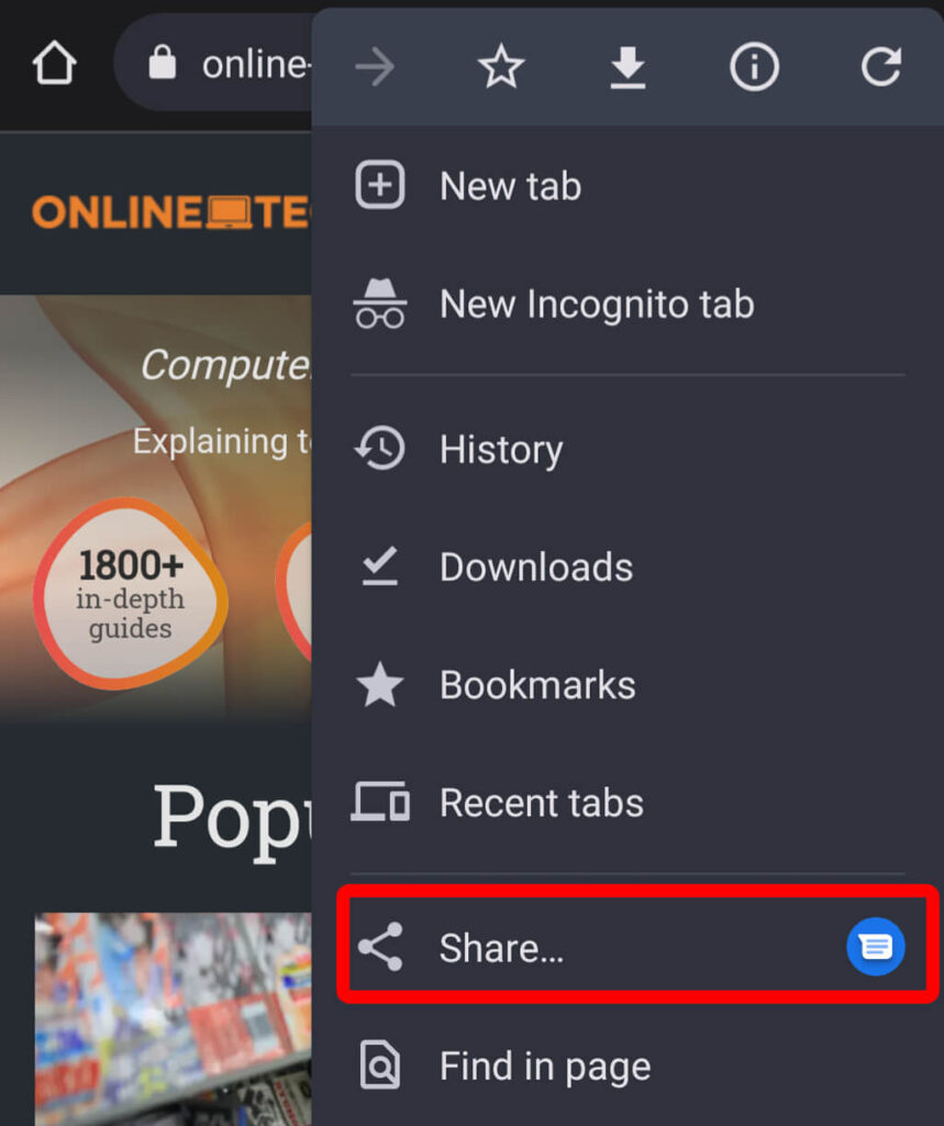 Whether you have an old Pixel phone or the newest Samsung Galaxy S22, the share option in Chrome on an Android phone or tablet is in the More icon’s drop-down menu.