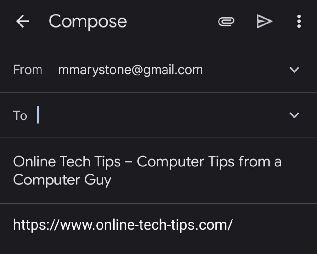 Sharing via an email app like Gmail will start a new email with the link to the website in the body of the message and the name of the website in the email’s subject field.