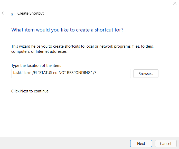 - Now in the target for the shortcut, we’ll enter the taskkill command, prefaced by taskkill.exe to allow it to run. Using the same command we demonstrated in the previous section, we get **taskkill.exe /FI “STATUS eq NOT RESPONDING” /F**.