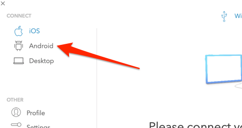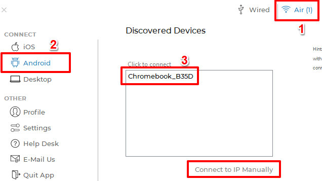 In the Air tab, select Android on the sidebar and click your Chromebook. If you still can’t find your Chromebook on the list of discovered devices, click Connect to IP Manually and enter your Chromebook’s IP address.