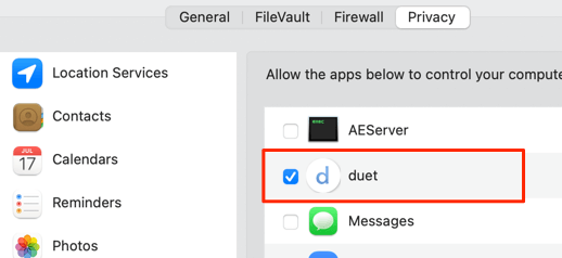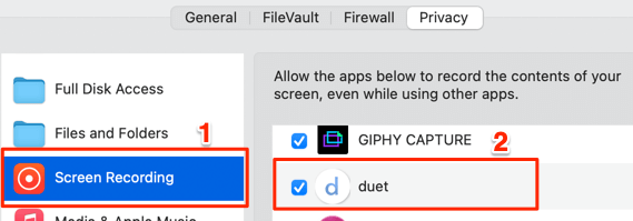 Next, for screen recording access; select Screen Recording on the sidebar and check duet.