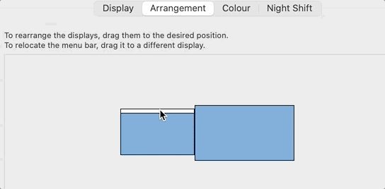 If you wish to modify or alternate the screen positions, go to System Preferences > Displays > Arrangement and drag the display (blue rectangle) to a different position. Interestingly, you can also move the menu bar only; drag the white rectangle at the top of the display to the second screen.