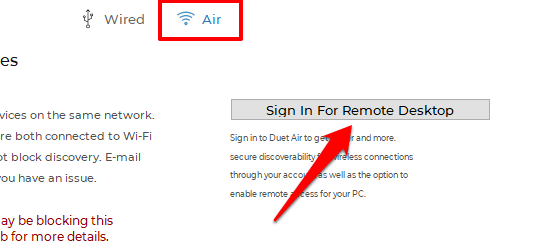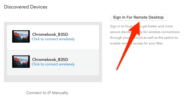 Although you can use the Dual Display’s Mac client without an account, signing into your Duet Account allows for a secured and faster connection with your Chromebook. Therefore, we recommend signing in to your Duet Air account; launching the app and clicking Sign In For Remote Desktop.