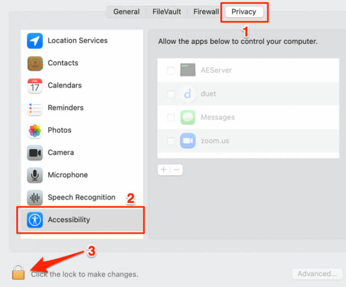 If your Mac runs macOS Catalina (10.15) or later, you’ll need to grant the Duet Display “Accessibility” and Screen access. Go to System Preferences > Security & Privacy > Privacy > Accessibility and click the lock icon at the window’s bottom-left corner.