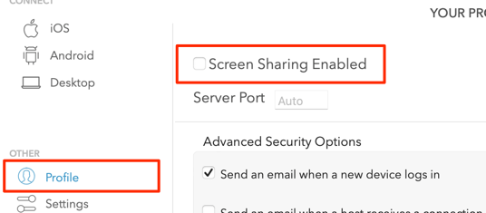 There’s one last thing you need to do: enable screen sharing within the Duet app. Click Profile on the sidebar and check Screen Sharing Enabled.