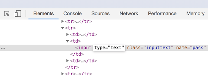 - The code for the password field will be highlighted in the console. Double-click on password in the ** tag, rename it to text**, and hit Enter.
