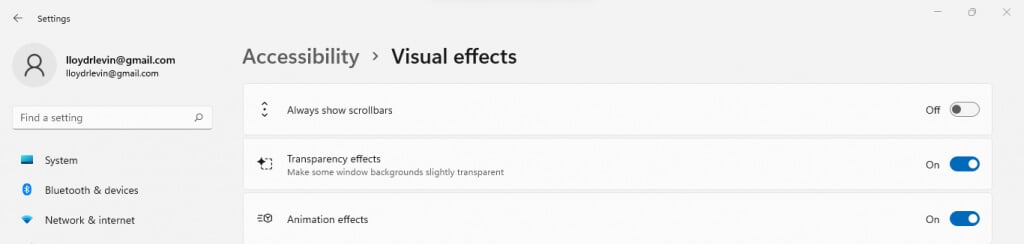 - The relevant settings are located right at the top of the window. Disable Transparency effects and Animation effects by toggling them off.