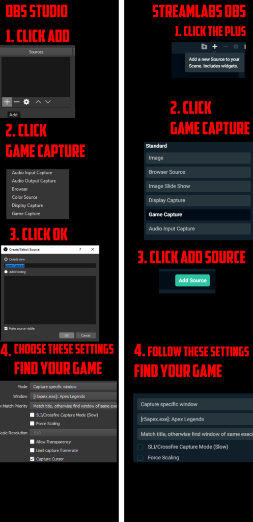 The image above explains the process. Once you’ve added the source,** record a full game.** Then once it’s finished, watch the video playback. Did it stutter at all? If so, try lower settings. Keep trying until you find the sweet spot.