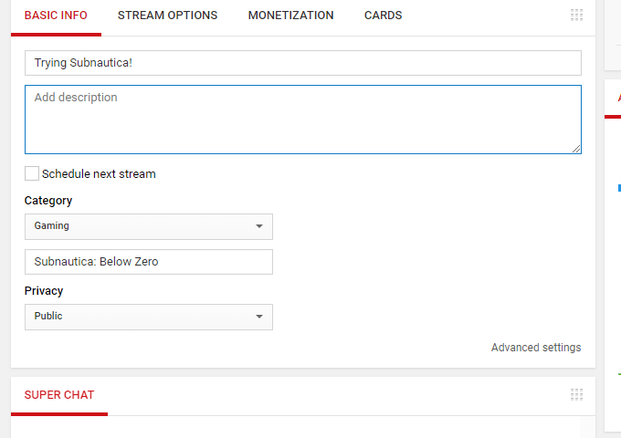 You will now be on your live stream dashboard. From here you can choose your stream title, choose a game, add a description, check your chat, view monetization options and more.