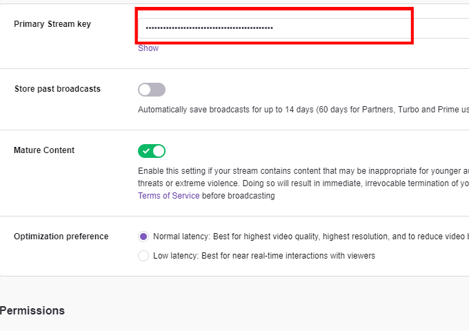 To get your streaming software to stream directly to your Twitch, YouTube, or other channel, you will need a stream key. This is a secret authentication key that you should never share with somebody else.
