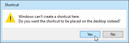 You’ll likely get an error message saying “Windows can’t create a shortcut here. Do you want the shortcut to be placed on the desktop instead?” Select Yes.