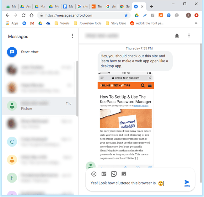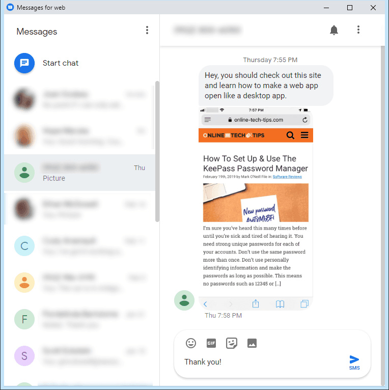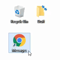 You’ll also need the web address or URL of a web app that you use frequently. For our purposes, we’ll use Google’s Messages for Web app. If you’ve got an Android-based phone, you should look into using Messages for Web. It’s a great way to send and receive text messages on your computer. Go check it out at https://messages.android.com/.
