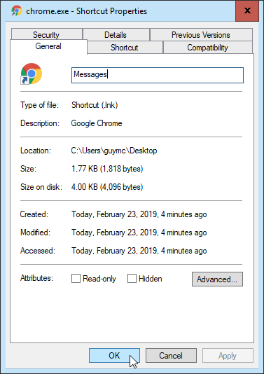 At the top of the tabbed-page, you’ll see the name is set as chrome.exe – Shortcut. Delete that and enter the name of your web app. Click on the OK button at the bottom of this window.