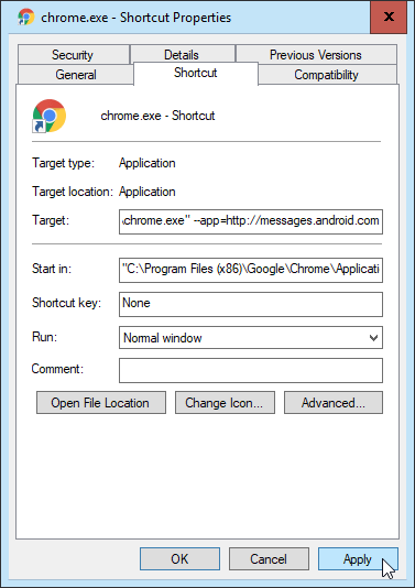 The =https://messages.android.com part tells Chrome to open up directly to that website, or web app. You can substitute that address with the web address of any web app you like. Click Apply.