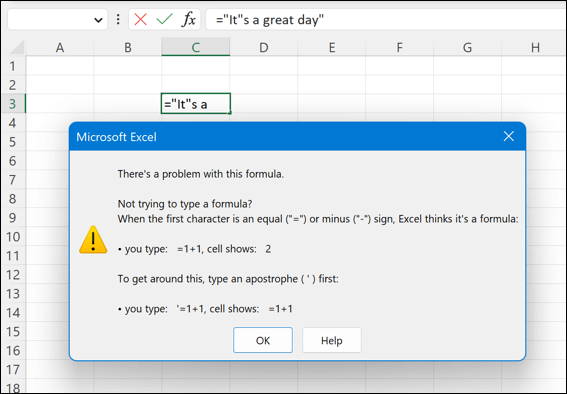 If you have a quotation mark or apostrophe in your formula, consider using double quotation marks to represent a single quotation mark. For example, instead of =”It’s a great day”, use =”It””s a great day”.