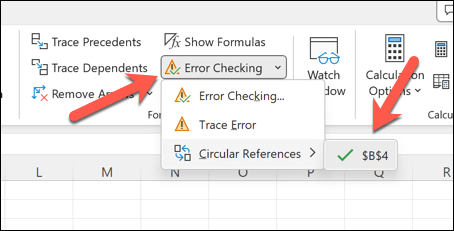 - In the Formula Auditing section, press Error Checking > Circular References.