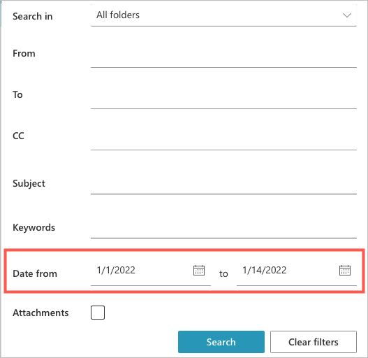 - When the filter fields display, look for the **Received** entry. Type the start and end date range for the email you need. You can also use the pop-up calendars to pick the dates by selecting the arrow next to each date field.