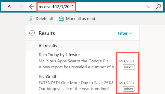 In the desktop or web versions of Outlook, you can use the following types of search queries to find email messages received by date. Simply enter one in the Search field and press your Enter or Return key.