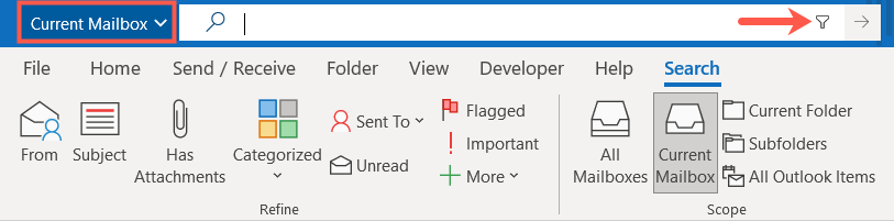 - Head to the Search box at the top. You should see an option for Current Mailbox to switch mailboxes or subfolders immediately, but you can also do this in the filter section.