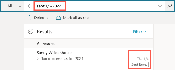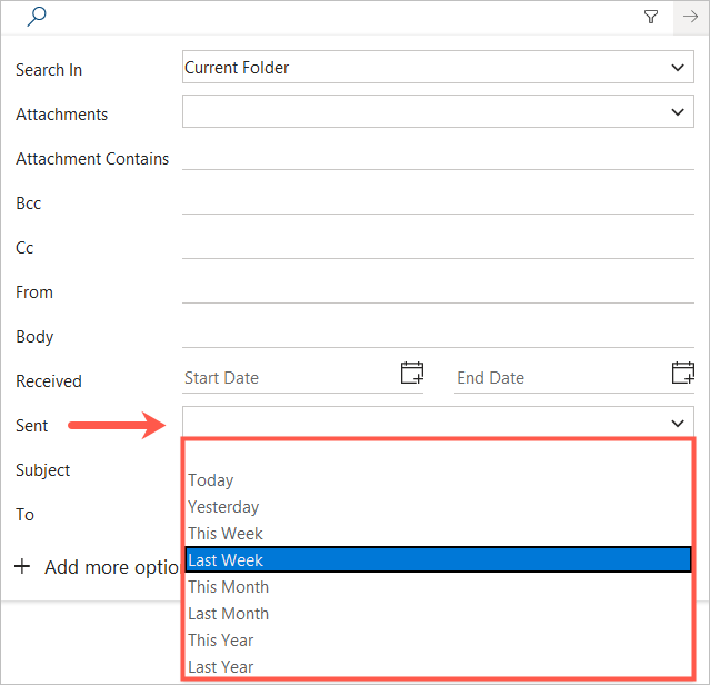 - To find emails you sent instead of those you received, use the **Sent** drop-down list to pick an option like Today, Yesterday, Last Week, or This Month.
