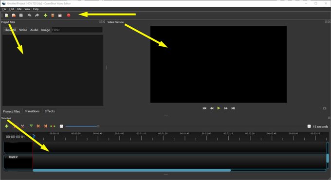 Launch OpenShot, and you’ll see that the interface is separated into four main areas: Main Toolbar, Project Files, Timeline, and Video Preview.