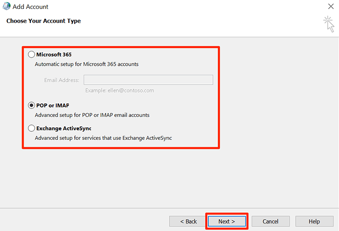 - Select your email account type and click **Next** at the bottom. If you have POP3 or IMAP details for your email account, select that option and you can then manually configure the account settings.