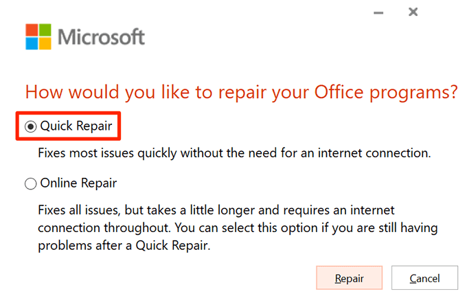 - The repair tool will ask how you want to repair Outlook and other Office apps. Choose **Quick Repair** and see if it fixes the problem. If it doesn’t, select the **Online Repair** option for a thorough repair of your apps.