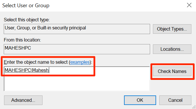 - Put your cursor in the **Enter the object name****to select** box, type your computer username, and click **Check Names**. Then click **OK**.
