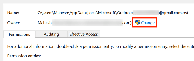 - Click **Change** next to where it says **Owner** to change the owner of your selected file.
