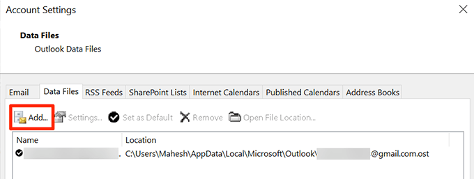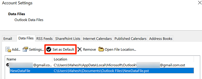 - Outlook will still use your old data file to save your messages. Change that by setting your new data file as the default data file. Select your newly created file in the list and click **Set as Default** at the top.
