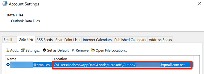 - The following screen will have a file entry with a checkmark icon next to it. Note the location of this Outlook data file.