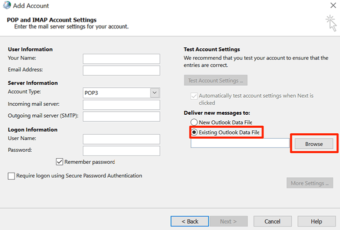 - Fill-in the email account information on the following screen. When you’re done, select **Existing Outlook Data File** from the **Deliver new messages****to** section and then click the **Browse** button.