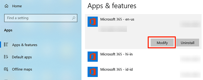 - Scroll down the apps list until you find **Microsoft 365** or **Microsoft Office**. * Click the Office entry and select **Modify**.