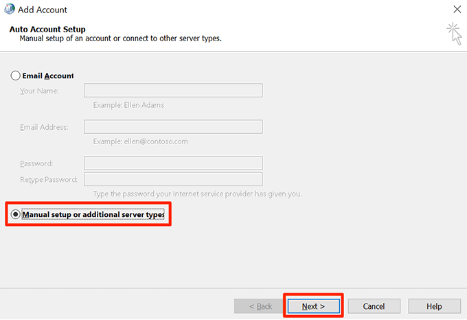 - The email setup wizard will now appear. Select the **Manual setup or additional server types** option and click **Next** to start setting up your email account with Outlook.