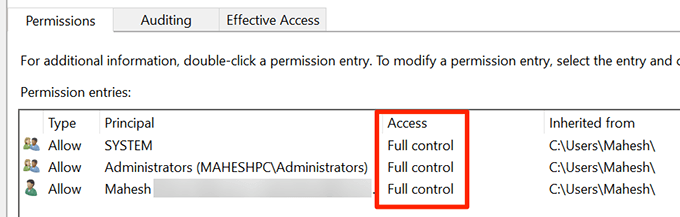 - Ensure the **Access** column says **Full control** next to your username. Then click **OK**.