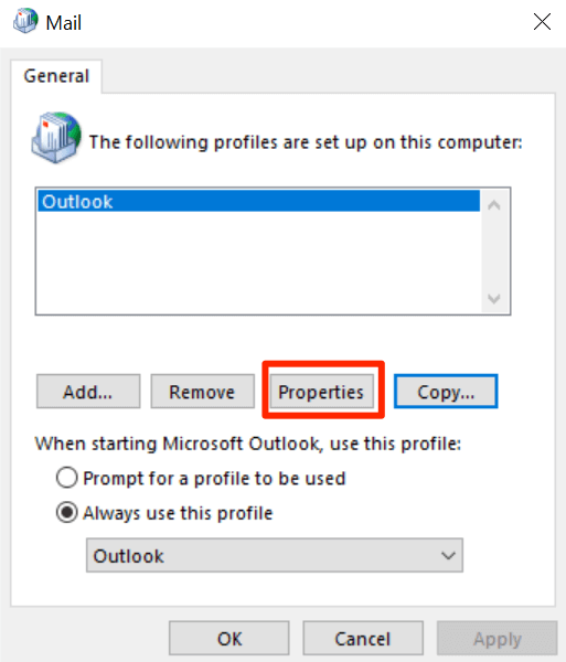 - Head to the Outlook data file’s path you noted earlier and select that file. * Finish the email account setup wizard. * Go back to the **Mail** box, choose your newly created profile from the **Always use this profile** menu, and click **OK**. This will make your new profile the default email profile for Outlook.