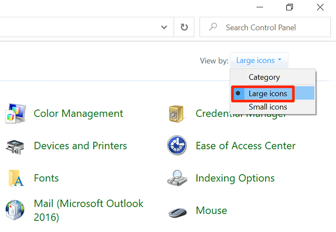 - Click the **View by **menu at the top-right corner and ensure the **Large icons** option is selected.