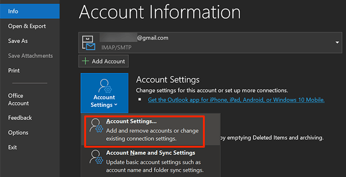 - Select **Info** from the options in the left sidebar. Then click **Account Settings** on the right-hand side pane and select **Account Settings **again.