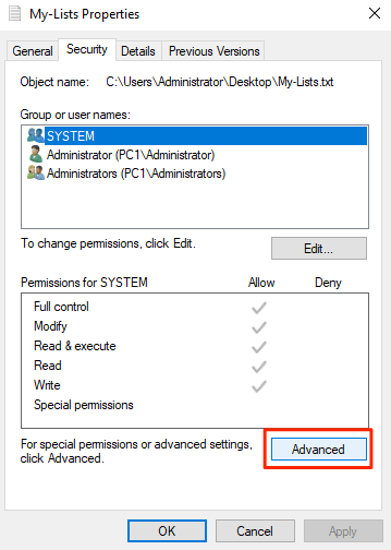 - In the Security tab, you’ll find a button saying Advanced at the bottom. Click on it and it’ll open a new dialog box.